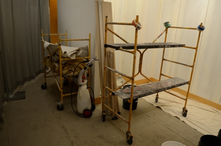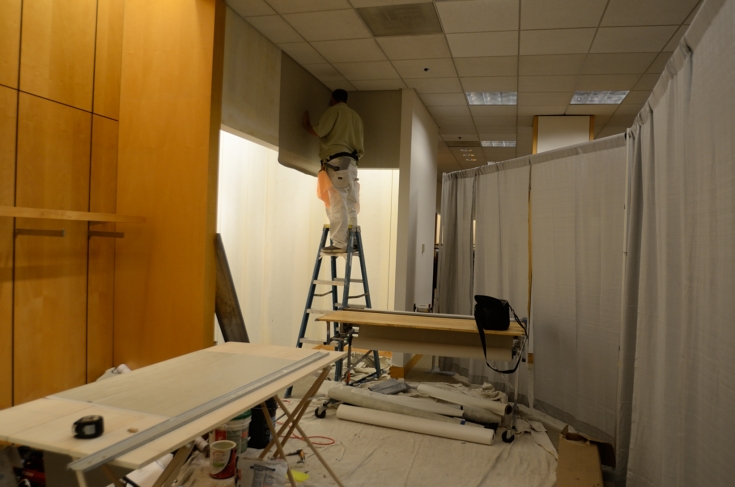 We removed the existing white vinyl wall covering on the soffit and the fabric wallcoverings on the back wall. We installed new vinyl wallcoverings on the soffits and back wall.